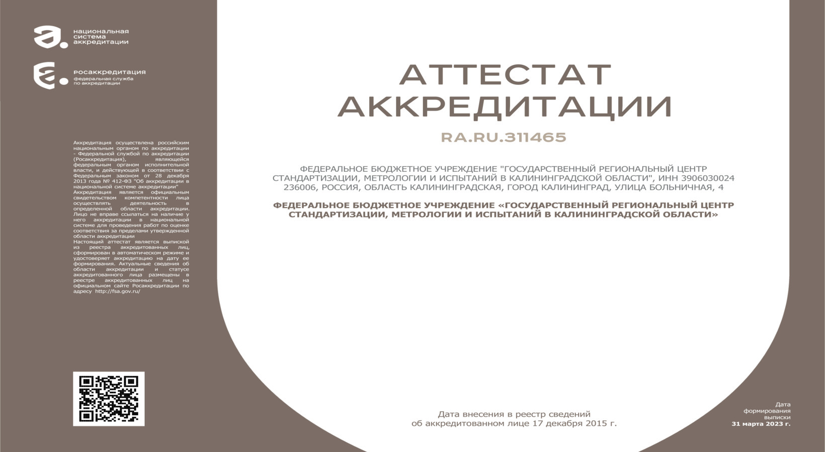 Федеральное бюджетное учреждение «Государственный региональный центр стандартизации, метрологии и испытаний в Калининградской области».
